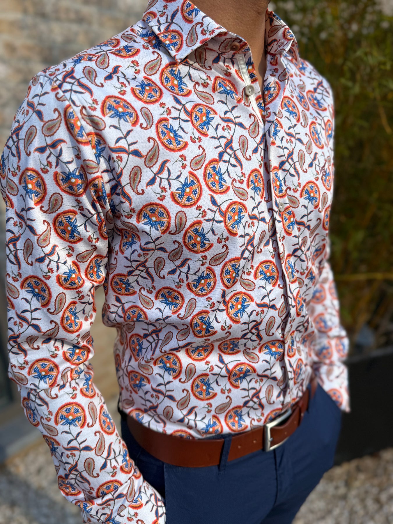 Chemise imprimée à col boutons "cachés" dans les tissus pour un meilleur maintien.