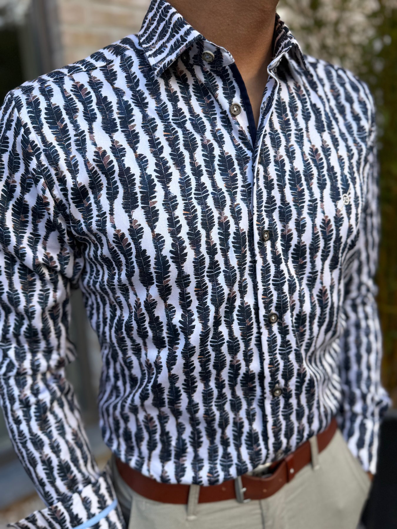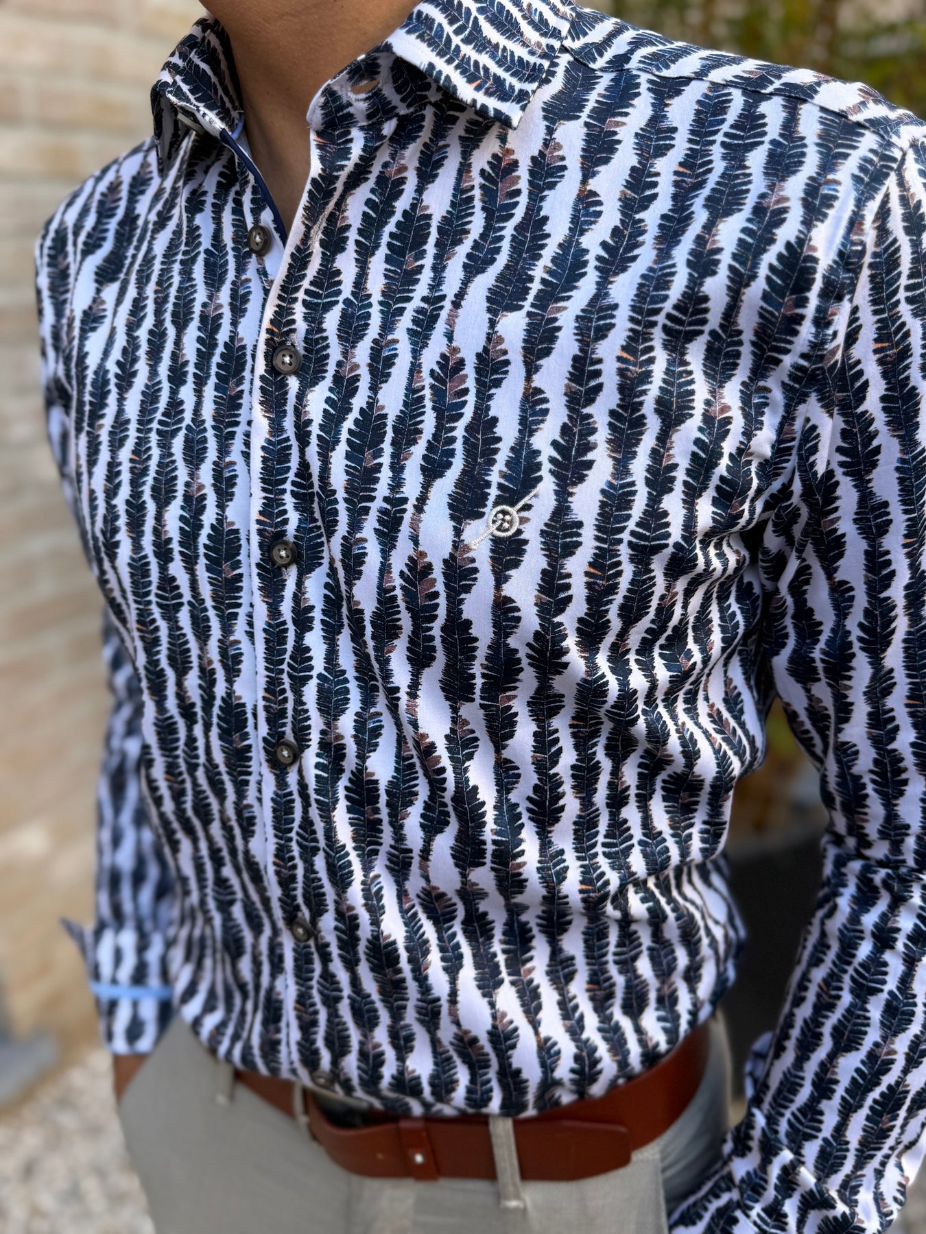 Chemise imprimée à col boutons "cachés" dans les tissus pour un meilleur maintien.