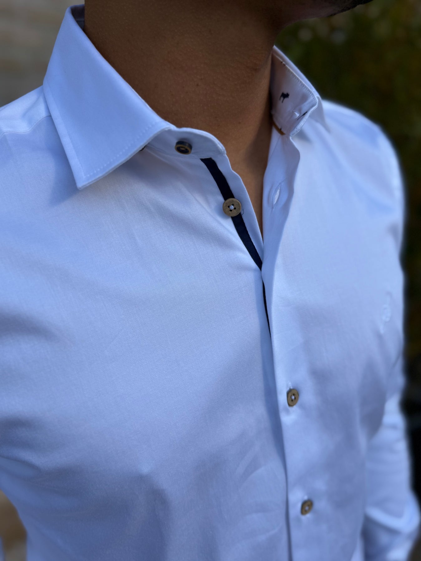 Chemise unie BLANCHE à col boutons "cachés" dans le tissus pour un meilleur maintien.